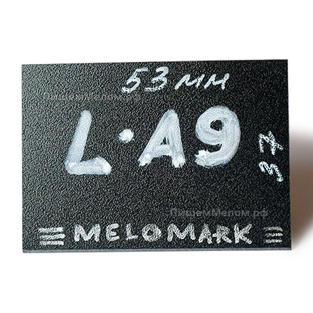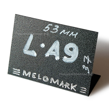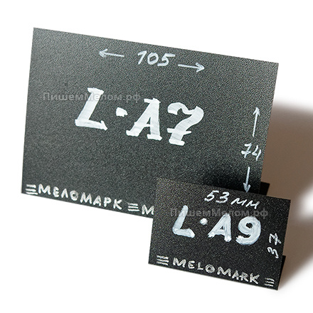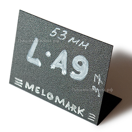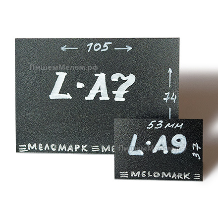 Изготовлены ценники из чёрного пластика «мелкая шагрень» толщиной 0,5 мм, поверхность которого подходит для письма мелом или меловым маркером. Ценники многоразовые: после нанесения надписей на них не остаётся царапин, а для удаления информации достаточно воспользоваться обычными влажными салфетками, губкой или бытовыми средствами. Ценники устойчивы к воздействию влаги, что не только увеличивает их срок эксплуатации, но и позволяет размещать на витринах с разными температурными режимами. Если для оформления витрины Вам нужны ценники бОльшего размера, то советуем обратить внимание на аналогичные L-образные ценники формата А8 и А7, которые имеют площадь для письма 74х53 мм и 105х74 мм соответственно.