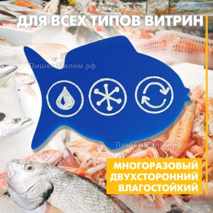 Фигурные меловые ценники "Рыбка" — стильный и функциональный аксессуар, который поможет привлечь внимание к Вашим товарам и повысить продажи. Они идеально подойдут для товаров в магазине и на рынке а отделе, в кафе и пекарне, в фермерской лавке и в других торговых точках. Эти меловые ценники органично впишутся в витрину с рыбой и морепродуктами, закусками и снеками, выделят в общем ассортименте блюда и выпечку с рыбой, сделают привлекательными прилавки магазина для рыбалки.